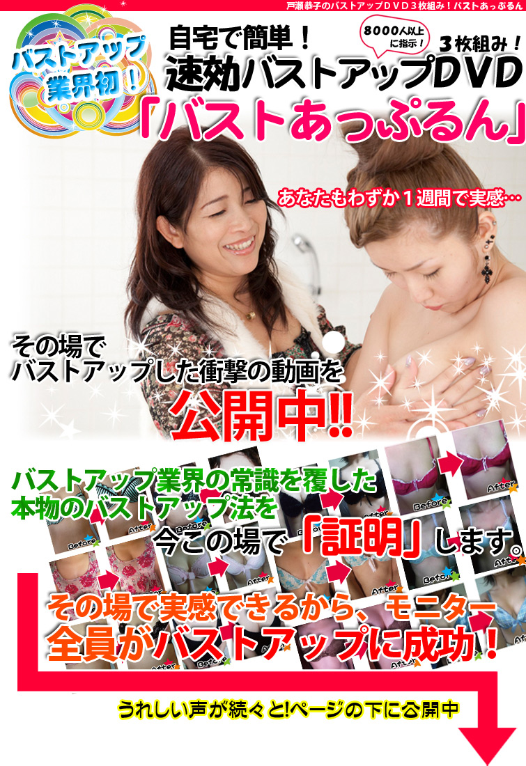 当ブログから、バストあっぷるんをお申込された方には、『バストあっぷるん』を実質無料にするスペシャル特典をプレゼント!自宅で簡単、速効バストアップDVD(3枚組!)バストあっぷるん 戸瀬恭子【バストアップ】
